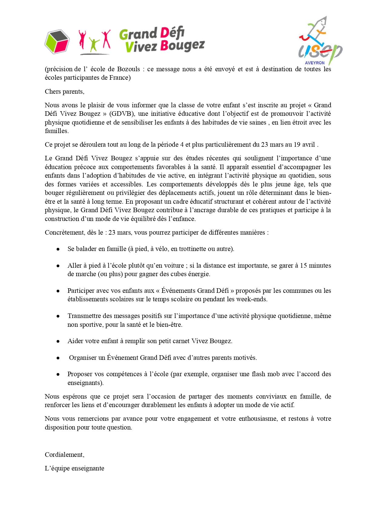 L’école s’est engagée dans le Grand Défi « Vivez-Bougez », proposé par l’USEP Occitanie, pour les quatre semaines à venir, jusqu’au dimanche 19 avril.